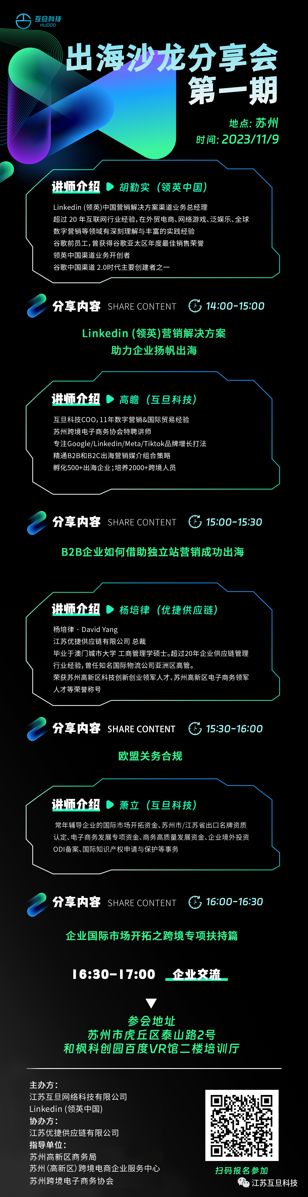 互旦科技是領英(中國)的官方合作伙伴,本次出海沙龍分享會由江蘇互旦網絡科技有限公司和Linkedin(領英中國)主辦, 由江蘇優捷供應鏈有限公司協辦,在此,我們也非常感謝蘇州高新區商務局、蘇州(高新區)跨境電商企業服務中心和蘇州跨境電子商務協會對本次活動的指導和支持!