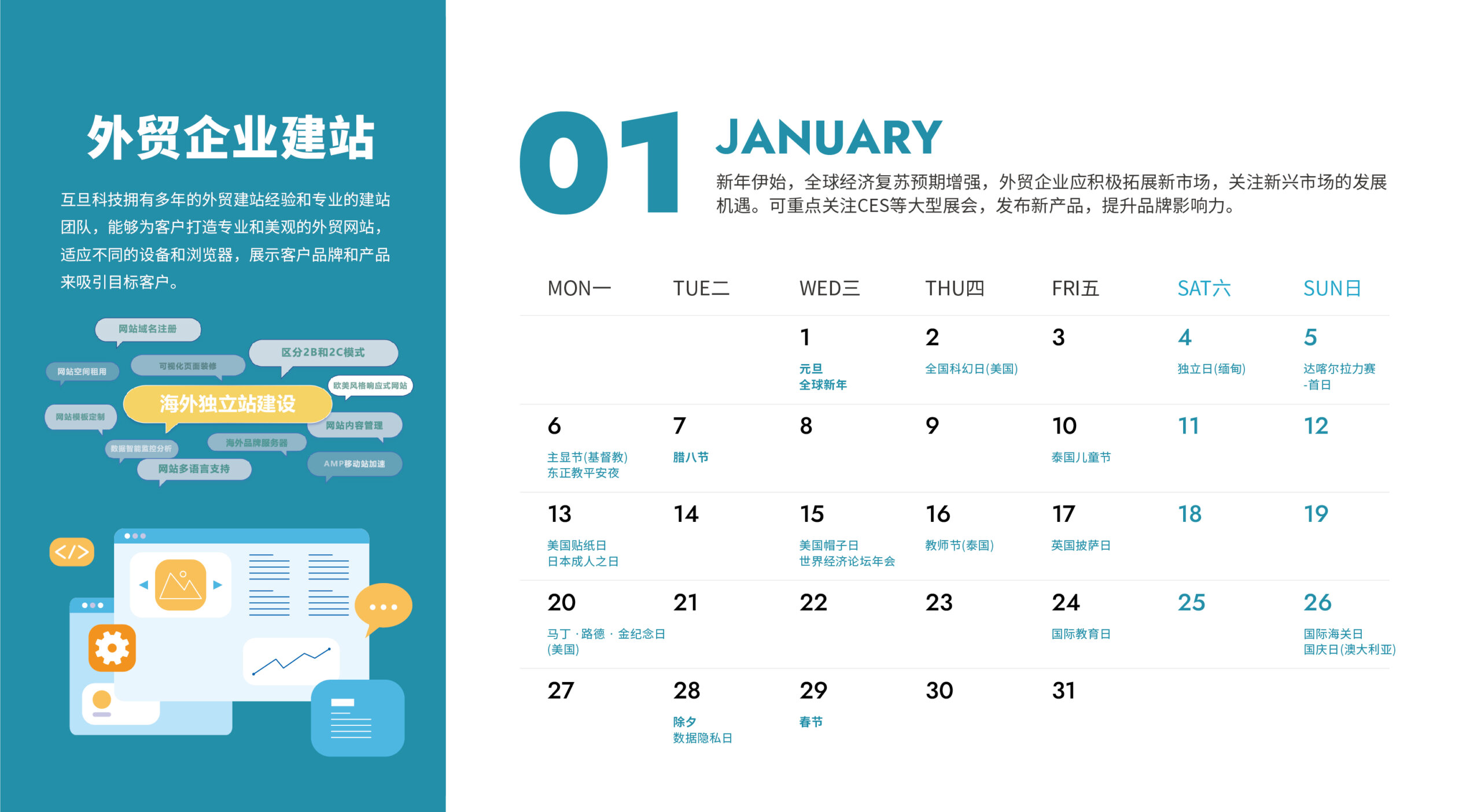 Hello!在做外貿行業的你,是否已經為2025年精心策劃,準備積極拓展海外市場,實現品牌和銷量的雙豐收?是否希望緊抓全球重要節日和營銷節點,打破邊界,收獲“贏銷”紅利?如果你的答案是YES,那么互旦科技全新推出的《2025年度外貿營銷日歷》絕對是你精準出擊的必備出海營銷工具!