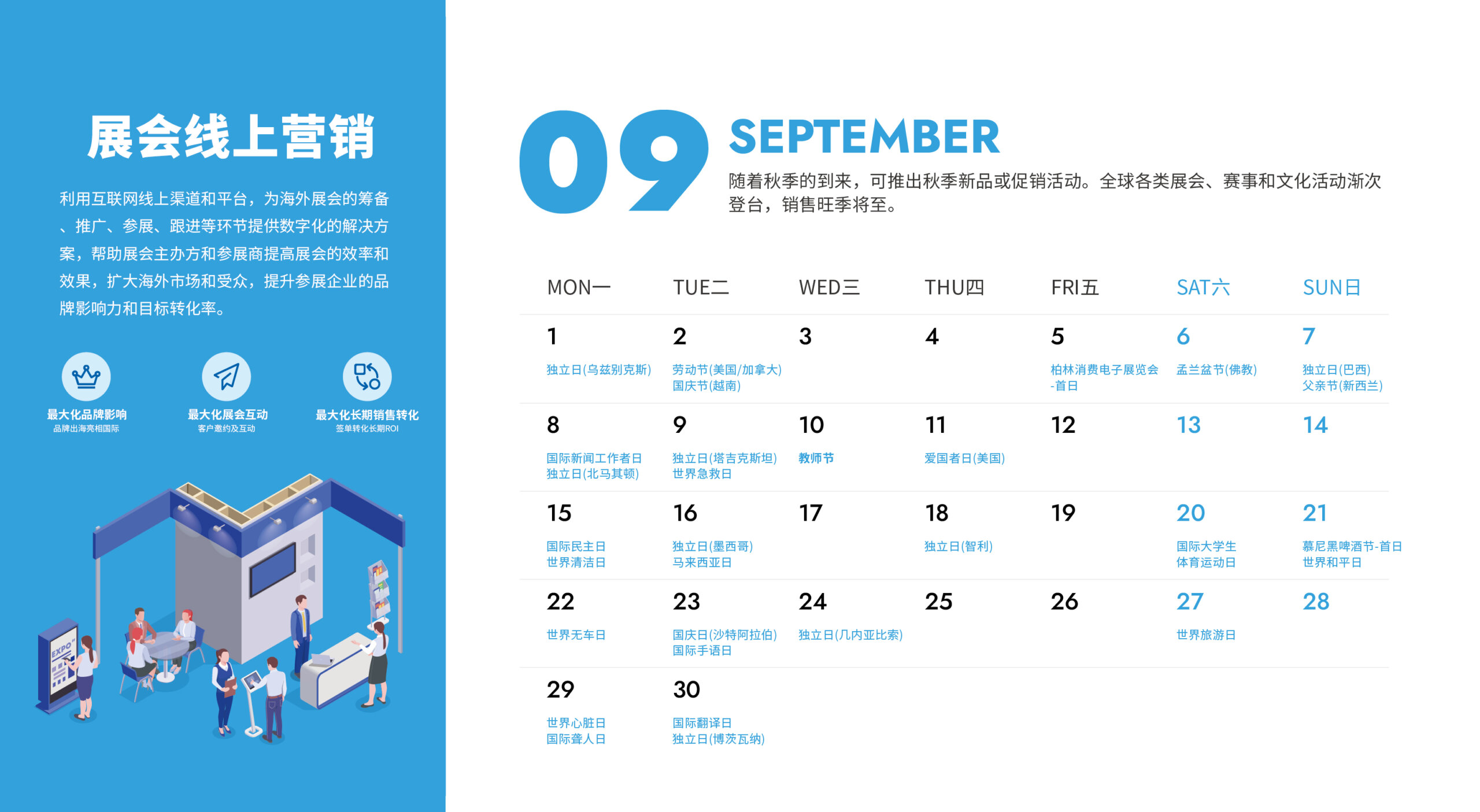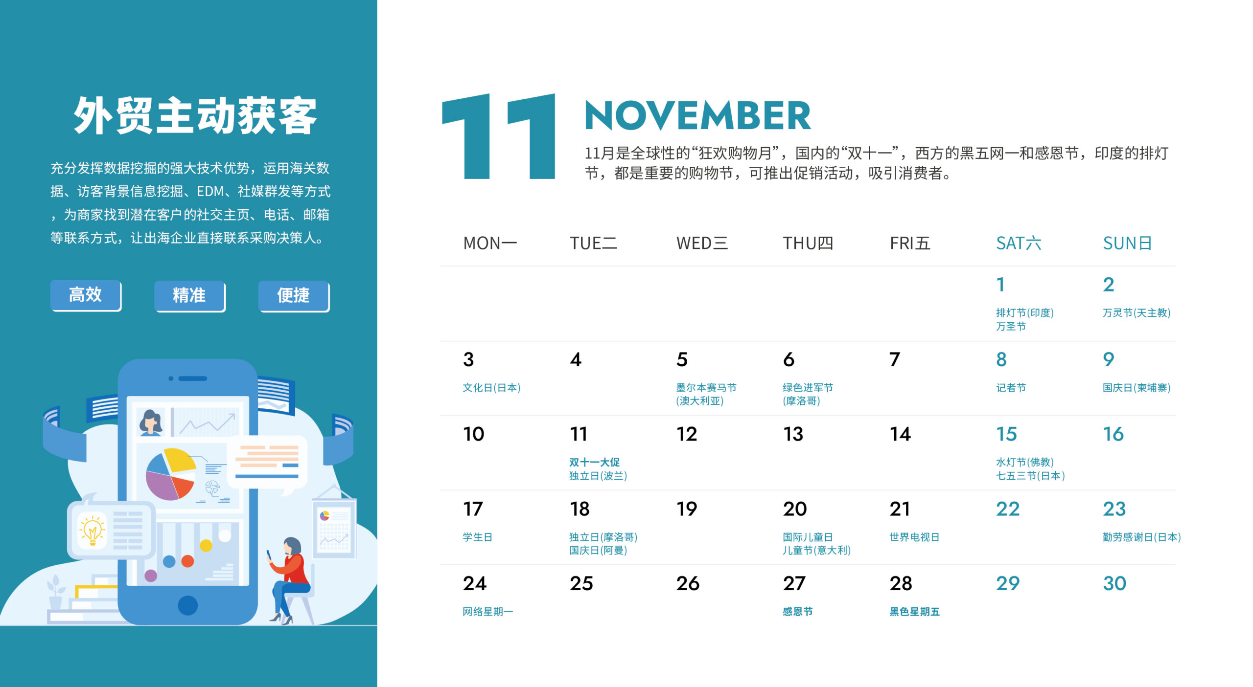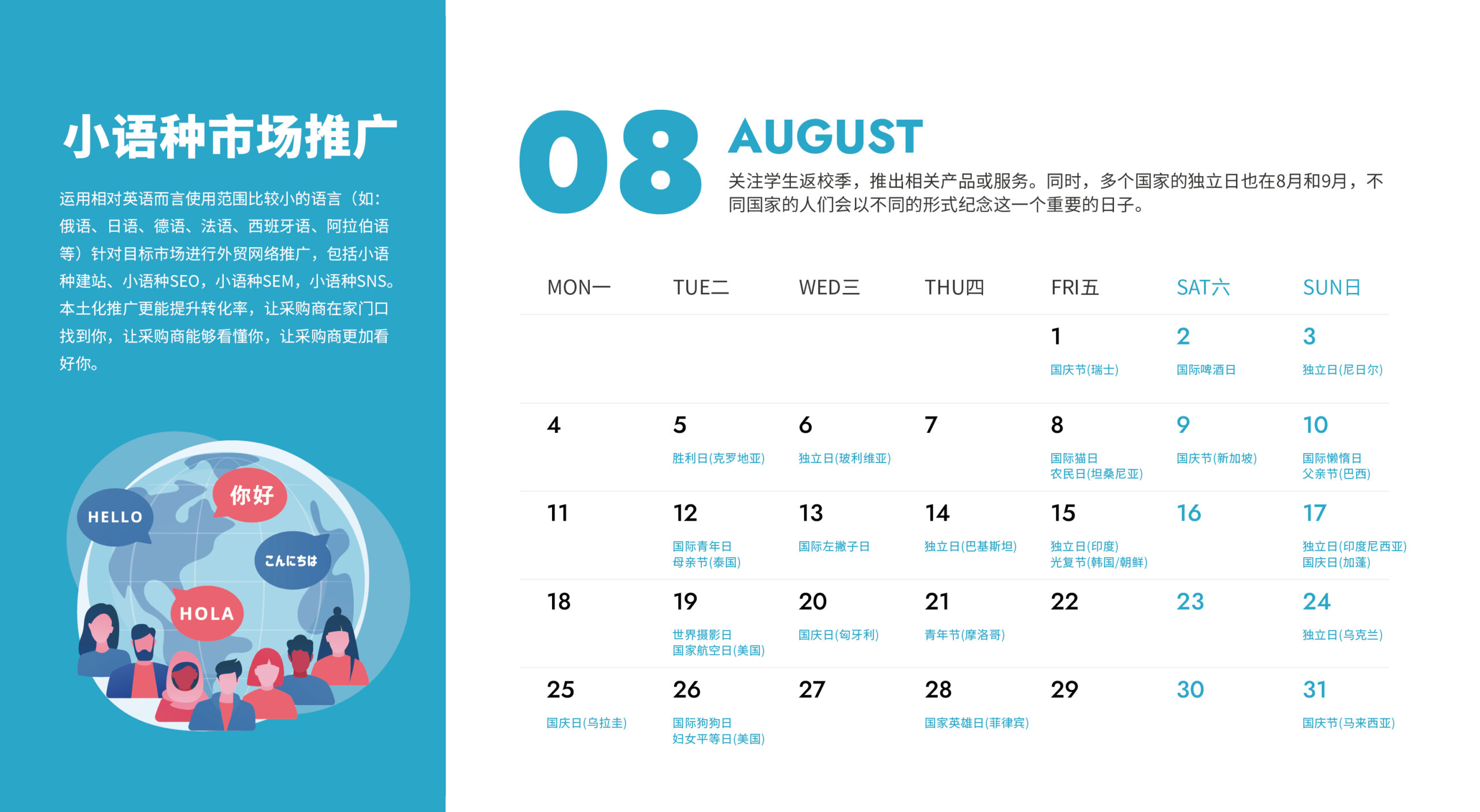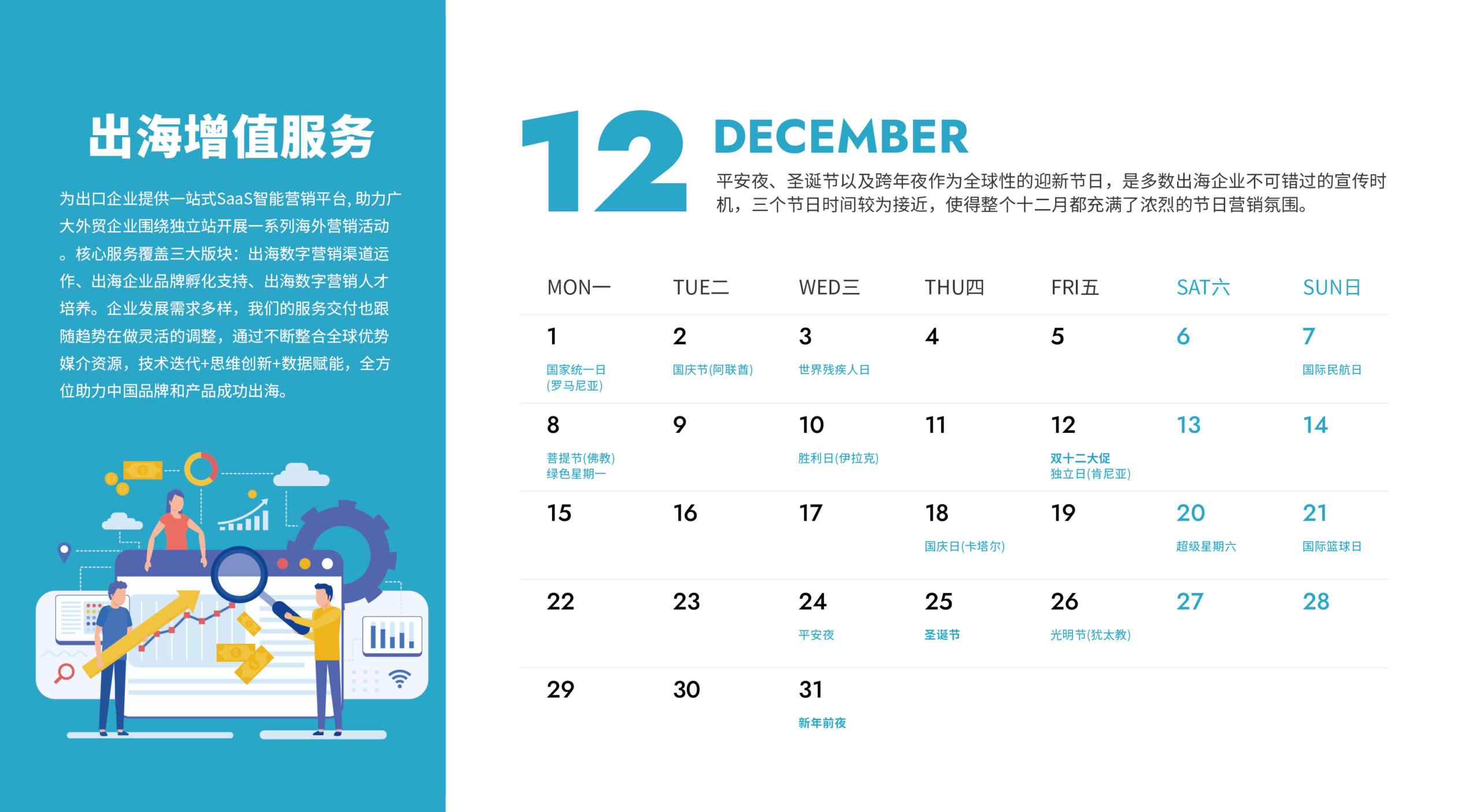 我們的《2025年度外貿營銷日歷》不僅是一份簡單的節日日期表,您可以把它當作一個全面的營銷伙伴。這份營銷日歷可以幫助您更及時、更全面、更深入地掌握海外市場的文化和消費習慣,增強品牌的親和力和市場競爭力。