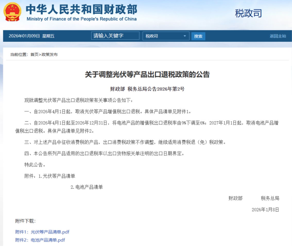 隨著財(cái)政部、稅務(wù)總局正式發(fā)布《關(guān)于調(diào)整光伏等產(chǎn)品出口退稅政策的公告》(2026 年第 2 號(hào)),光伏出口退稅的調(diào)整路徑已經(jīng)非常清晰:自 2026 年 4 月 1 日起,光伏等產(chǎn)品將取消增值稅出口退稅。一起來(lái)看這對(duì)出海企業(yè)有什么影響、釋放了什么信號(hào)、又需要如何提前布局?