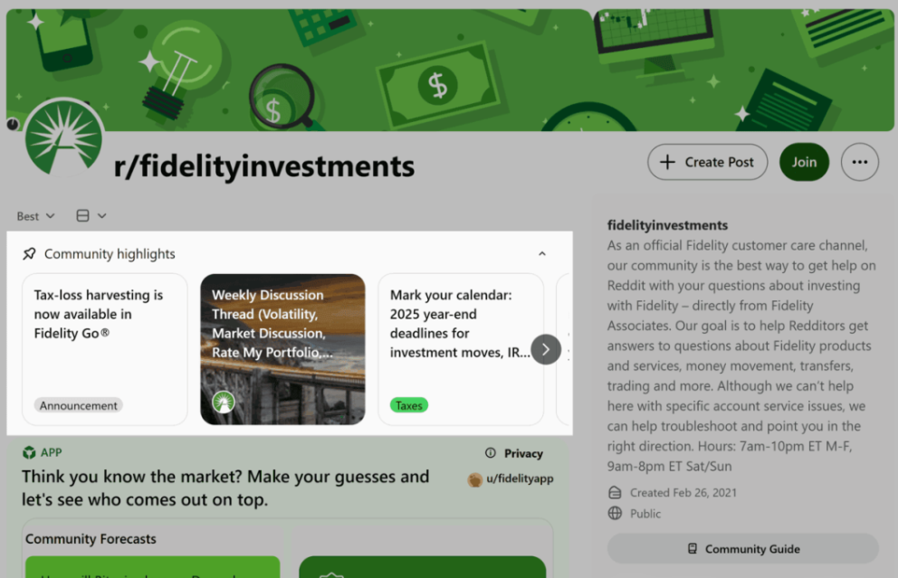 以 r/fidelityinvestments 為例。表面上它是一個官方客戶支持社區,但真正支撐其活躍度的,并不是品牌輸出,而是: