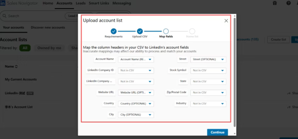 你可以把已經整理好的?公司清單(Account List)?直接導入 LinkedIn。這些公司名單可以來自 CRM、過往客戶、展會名錄,甚至是第三方數據庫。只要包含公司名稱、官網、城市或地區等基礎信息,LinkedIn 就能自動在自己的數據庫中進行匹配,判斷這些公司是否擁有可用的企業主頁。