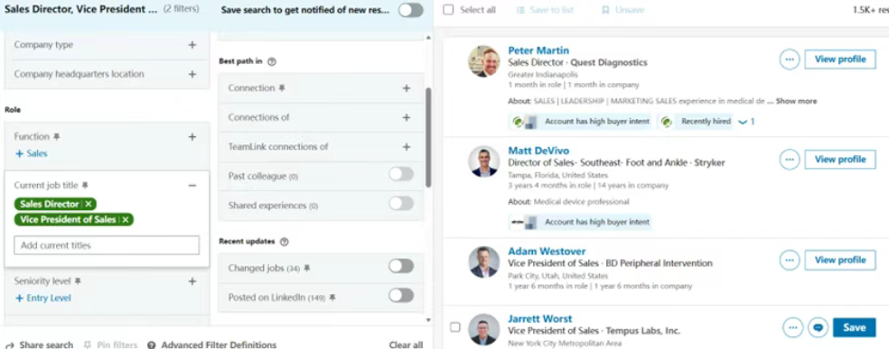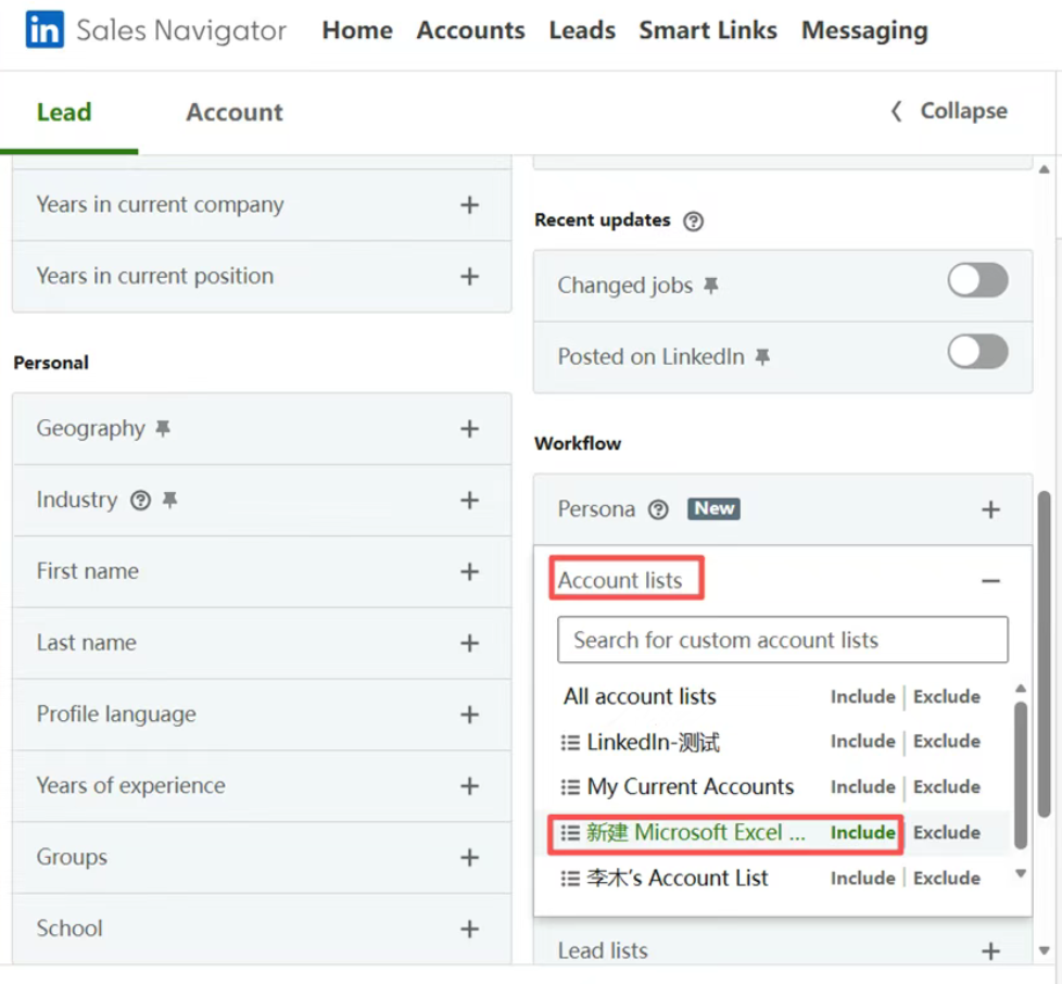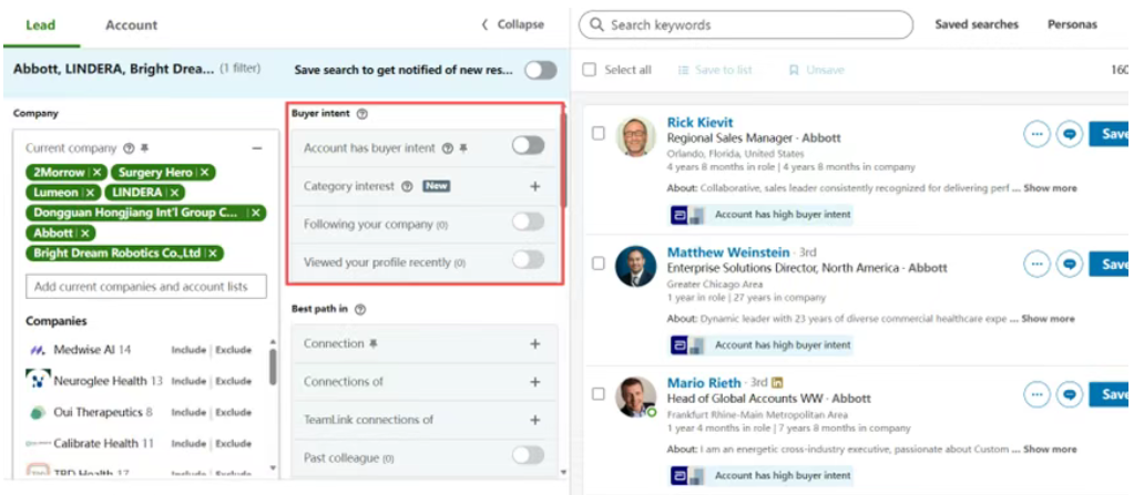 進入潛在客戶篩選器后,你可以把剛剛整理好的公司列表導入系統,Sales Navigator 會幫你匹配出這些公司的在職人員。接下來,利用職位、職能、級別、地區等條件,逐步縮小范圍。比如,你想找銷售總監、采購經理、技術負責人,甚至是 CEO 或創始人,都可以精準篩選。