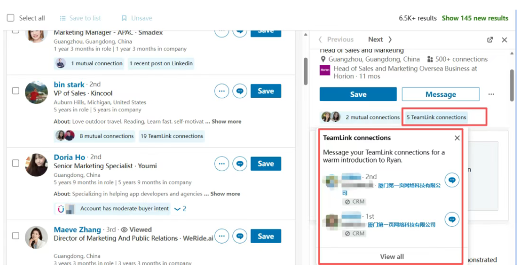 TeamLink會提示你,客戶是否與你的同事存在一度或二度關系。。很多時候,你自己是冷的,但團隊關系是熱的。通過內部引薦,不僅能提高回復率,也能避免團隊內部重復跟進同一客戶。