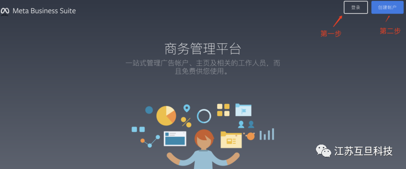 注冊(cè)鏈接:https://business.facebook.com,登錄個(gè)人Facebook賬號(hào),然后點(diǎn)擊創(chuàng)建賬戶(注:一個(gè)FB個(gè)人賬號(hào)最多可以注冊(cè)2個(gè)BM)