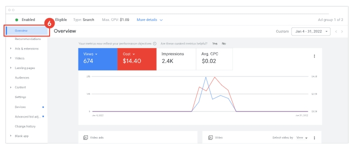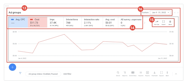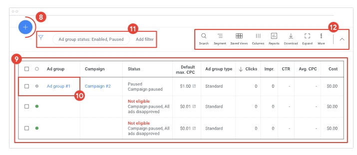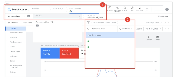 ② 您可以使用導航面板來選擇廣告系列或廣告組。