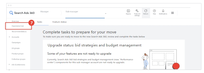 ⑦ 在查看子級經理賬號時,可以通過頁面菜單來訪問體驗中心 。通過體驗中心可以及時了解即將推出的功能,以及所有最新的增強功能。