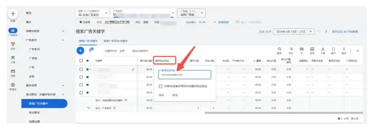 經常有用戶提問,是否可以在搜索廣告的關鍵詞設置里,為每個不同的關鍵詞設置不同的落地頁。今天我們就來分享一下在關鍵詞層級設置最終到達URL(用戶在點擊鏈接或執行某個操作后,最終被引導到的目標網頁地址。)的方法分享。