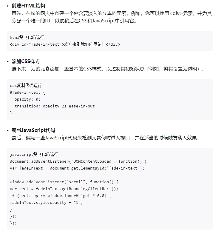 這段代碼首先等待文檔加載完成,然后獲取我們之前創建的<div>元素。接著,它監聽頁面滾動事件,并檢查元素的頂部是否在視口的80%以內。如果是這樣,它將元素的透明度設置為1,從而觸發淡入效果。