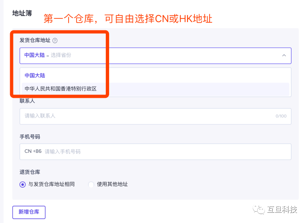 若第一個選擇大陸倉,新增倉庫(第二個倉庫)僅能選擇香港倉,反之同理